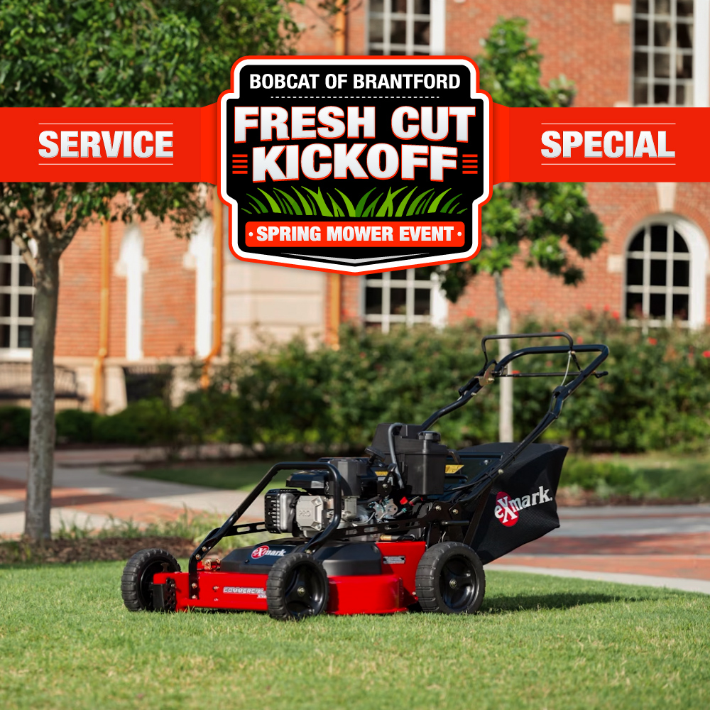 Take advantage of our Fresh Cut Kickoff and receive a 20-point inspection plus engine oil and filter change for just $250.00 + HST on Bobcat and Exmark mowers — PLUS FREE PICK UP AND DELIVERY*!